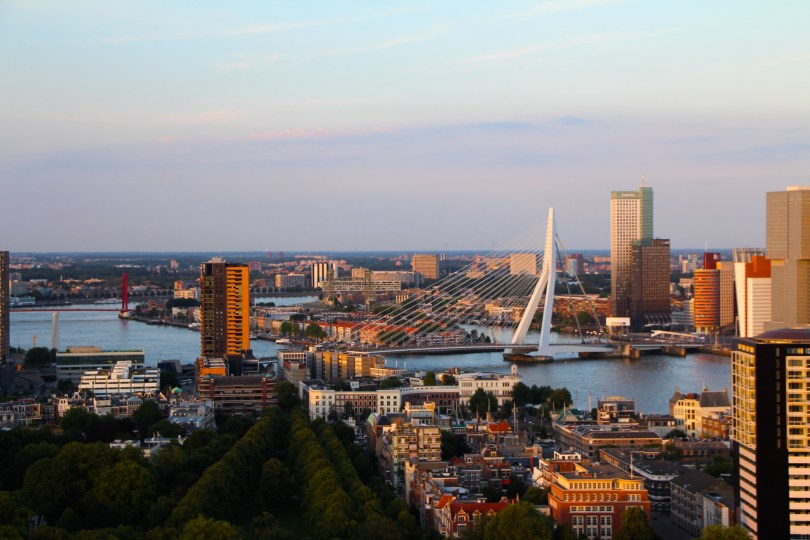 IMG_1917 August 4, 2013 5184 × 3456 Euromast The white suspension bridge is the Erasmus Bridge, known locally as the Swan. Look to the distance towards the red bridge…the island I’m living on is between the two bridges